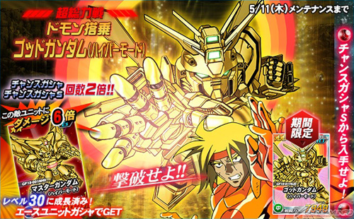 総力戦「シャッフル同盟」&超総力戦「ドモン搭乗ゴッドガンダム(ハイパーモード)」同時開催。エースユニットガシャ「★4 ゴッドガンダム(ハイパーモード)」など登場。Gガンダム系ユニット★3以上確率アップキャンペーン開催。潜入ミッション新エリア「南太平洋」追加、ゴールデンログインボーナスも開始。