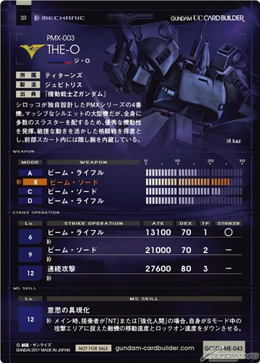 「410」というコストに見合うだけのハイスペックカード。スキル「意思の具現化」は戦術レベル12からしか発動しないがその効果は驚異的。かならず「NT」か「強化人間」を搭乗させたい。