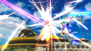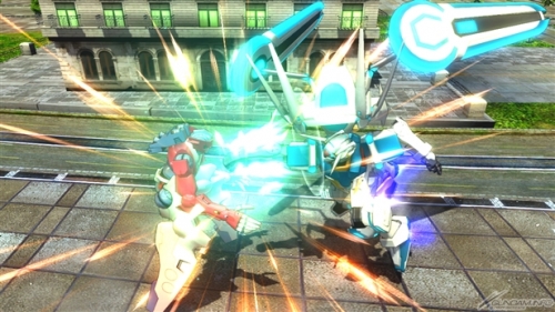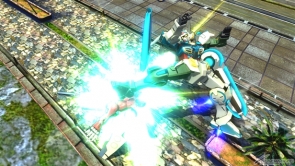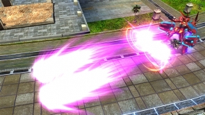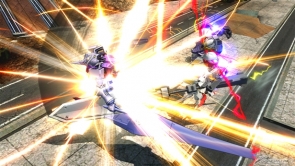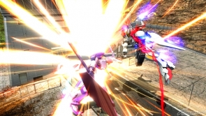 ▲バーストアタック「バックパック換装コンボ」は、ビーム・サーベルで斬りつけ、高トルクモードでパンチやキックの乱舞攻撃。その後、全方位レーザーを撃ち、アサルトモードで射撃攻撃を行いフィニッシュを決める。
