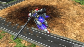 ▲バーストアタック「メイス連続攻撃」は、ソードメイスを叩き付けるように格闘攻撃を行った後、1度ターンして距離をとってから斬り抜け攻撃を行う。その後、クロー攻撃から蹴りを行い、ソードメイスを上空に投げつつ両腕の腕部200m砲から実体弾を3発発射。ツインメイスと蹴りによる3連撃を行った後、上空に投げたソードメイスをキャッチして斬り下し攻撃を行いフィニッシュを決める。