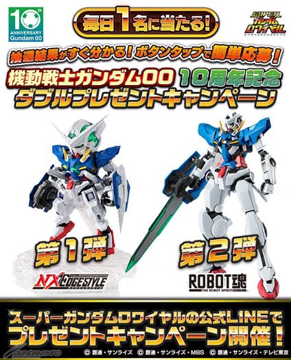 『機動戦士ガンダム00』の10周年を記念して、「機動戦士ガンダム00 10周年記念ダブルプレゼントキャンペーン」が開催。第1弾では「ネクスエッジスタイル[MS UNIT] ガンダムエクシア」、第2弾では「ROBOT魂<SIDE MS> ガンダムエクシアリペアII&リペアIIIパーツセット」が、抽選で毎日1名に当たる。応募受付期間は、第1弾が本日から7月25日(火)23:59まで、第2弾は7月27日(木)12:00から7月29日(土)23:59まで。応募はスーパーガンダムロワイヤル公式LINEアカウント( @sgundamr)から行うことができる。その他の詳細は、 こちら。