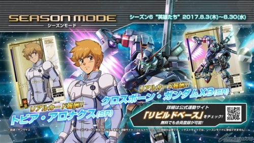 本日8月3日(木)より「シーズン6 英雄たち」がスタートした。本シーズンでは筐体からは払い出しされない新たなリアルカード「クロスボーン・ガンダムX3(SR)」と「トビア・アロナクス(SR)」を報酬として手に入れることができる。