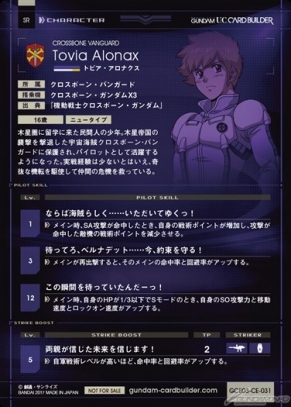 基本スペック、スキルともに高性能のパイロット。「クロスボーン・ガンダムX3」以外のメカニックに乗せても活躍が期待できる。