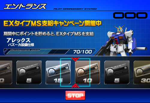 キャンペーンは、エクストラタイプMSの元となるMS「アレックス」または「ケンプファー」が既に支給されていることと、キャンペーン期間中に100ポイント貯めることが支給条件となっている。