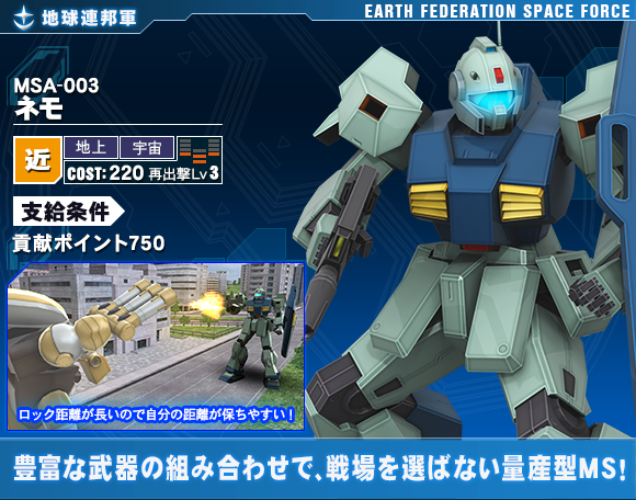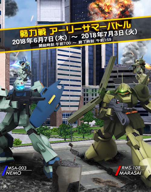 キャンペーンでは、先行支給MSに「ネモ」と「マラサイ(UC)」が登場。この他にも報酬として「武装支給チケット」や「勢力戦期間称号」などが用意されているのでぜひこの機会に参加してみよう。
