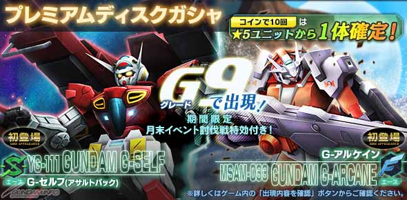 - 「G-セルフ(アサルトパック)」と「G-アルケイン」が新登場!「プレミアムディスクガシャ」新機体追加!