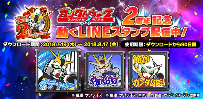 2周年を記念して「LINE: ガンダムウォーズ」オリジナルLINEスタンプの無料配信がスタート。ガンダムシリーズに出てくる数々の名セリフを含めた個性豊かな8種のアニメーションスタンプとなっている。入手方法はゲーム内のお知らせをご確認ください。