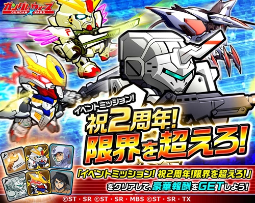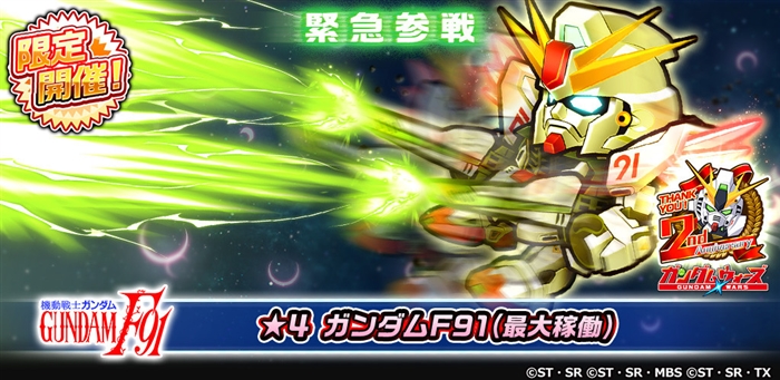 2周年を記念した期間限定のスペシャルガシャを開催。第1弾は新機体「★4 ガンダムF91(最大稼動)」が登場。このチャンスをお見逃しなく。