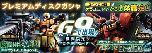 - 「ザクI(ダリル・ローレンツ機)」と「バウ(グレミー・トト専用機/G・ランチャー装備)」の2体が新登場!「プレミアムディスクガシャ - 新機体追加&特別任務特効付き」!