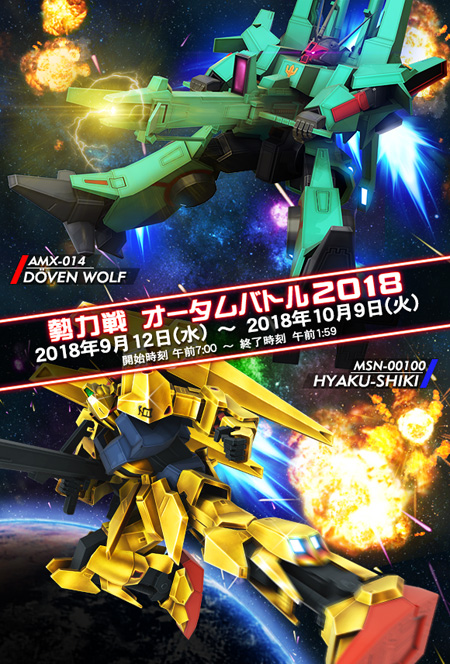 「オータムバトル2018」では、先行支給MSに「百式」と「ドーベン・ウルフ」が登場。この他にも勢力戦参加ボーナスや、報酬として「武装支給チケット」や「勢力戦期間称号」などが用意されているのでぜひこの機会に参加してみよう。開催期間は10月9日(火)まで。イベントの詳細についてはこちらのページをご覧ください。
