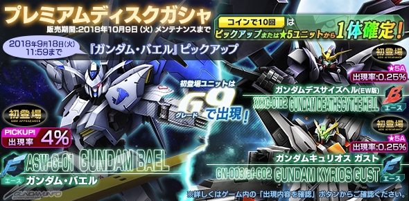 - プレミアムディスクガシャに「ガンダム・バエル」、「ガンダムキュリオス ガスト」、「ガンダムデスサイズヘル(EW版)」が新登場!「ガンダム・バエル」のピックアップ期間は、9月18日(火)11:59まで!