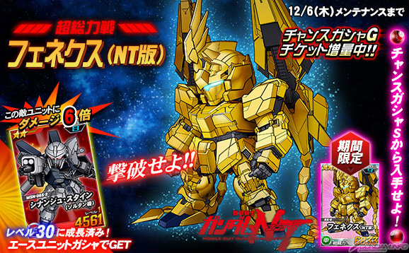 - 総力戦&超総力戦「フェネクス(NT版)」が登場!さらに6倍の攻撃力を発揮する「★2 グスタフ・カール(UC)」と、超総力戦「フェネクス(NT版)」に対し6倍の攻撃力を発揮する「★2 シナンジュ・スタイン(ゾルタン機)」がエースユニットガシャに登場!