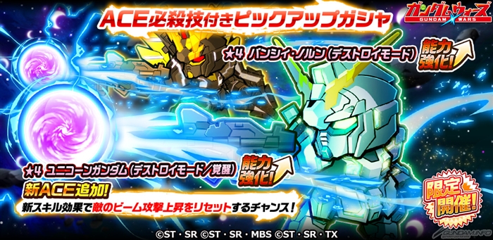 サポートキャラリリースを記念して、新ACE必殺技付きの「ユニコーンガンダム(デストロイモード/覚醒)」や、「バンシィ・ノルン(デストロイモード)」が期間限定でピックアップ中だ。この機会に強力な機体をゲットしよう。