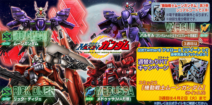 - 本日発売の「機動戦士ムーンガンダム」コミックス第3巻付属のシリアルコードをゲーム内で入力すると、「バルギル(ガンダムヘッド+サイコプレート搭載型)」が獲得できる!