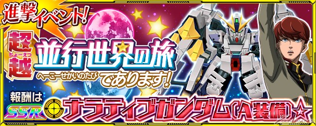 - 進撃イベント「超越並行世界の旅であります!」開催!報酬に、期間限定参戦『機動戦士ガンダムNT』より「ナラティブガンダム(A装備)☆」などが登場!
