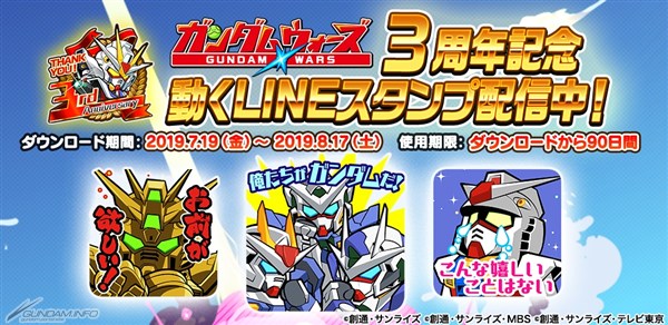 3周年を記念した「LINE: ガンダムウォーズ」のオリジナルLINEスタンプが配信中だ。スタンプは、ガンダムシリーズに出てくる数々の名セリフを含めた、個性豊かな8種のアニメーションスタンプとなっているの。入手方法はゲーム内のお知らせをご確認ください。
