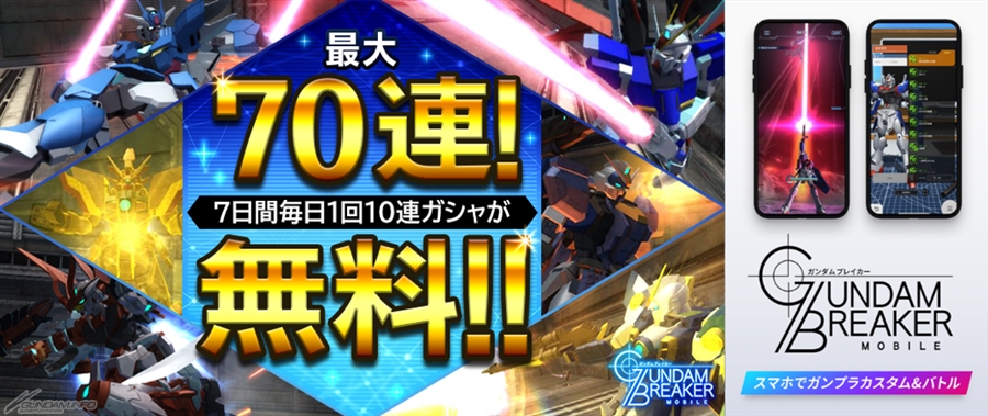 バンダイナムコエンターテインメントより好評配信中のiOS/Android向けスマートフォンゲームアプリ「ガンダムブレイカーモバイル」では、本日10月16日(水)より、7日間毎日10連ガシャが1回無料で引けるキャンペーンをスタートした。