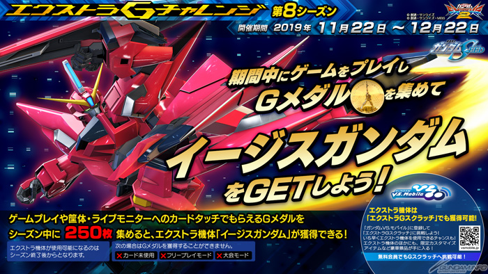 さらに、11月22日(金)から12月22日(日)に、エクストラ機体「イージスガンダム」が獲得できる「エクストラGチャレンジ」の開催が決定。期間中にゲームプレイや筐体・ライブモニターへのカードタッチでもらえる”Gメダル”を250枚集めると入手可能となっているので、お見逃しなく。