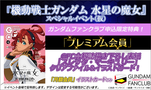 GFC特製グッズは、会報誌「ガンダムファンクラブマガジンVol.6」の表紙となるスレッタ・マーキュリーの描き下ろしイラストを使用しており、プレミアム会員向けには「クリアファイル&イラストカード」が、月額会員向けには「イラストカード」がプレゼントされる。