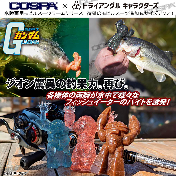 本格釣具メーカー「TRY-ANGLE」の”トライアングル キャラクターズ”とキャラクターグッズの「COSPA」がコラボレーションした「水陸両用モビルスーツワームシリーズ」に第二弾が登場。