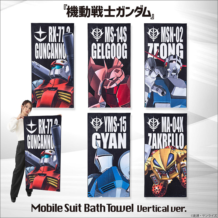 『機動戦士ガンダム』よりモビルスーツのイラストを大胆にフルカラーでデザインしたバスタオルが、縦向きと横向きの2モデルで登場。