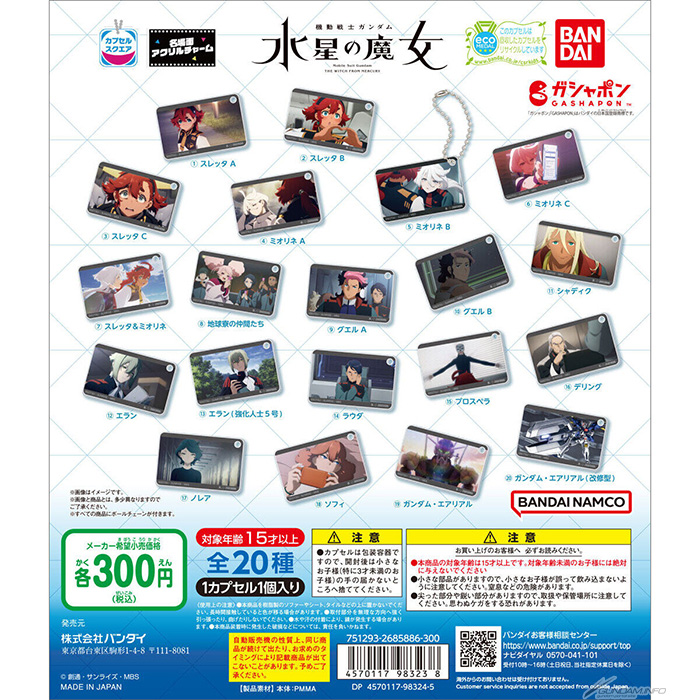 「バンダイナムコアミューズメント限定 カプセルスクエア名場面アクリルチャーム 機動戦士ガンダム 水星の魔女」が、ガシャポンオンラインに登場した。価格は1回300円(税込)。