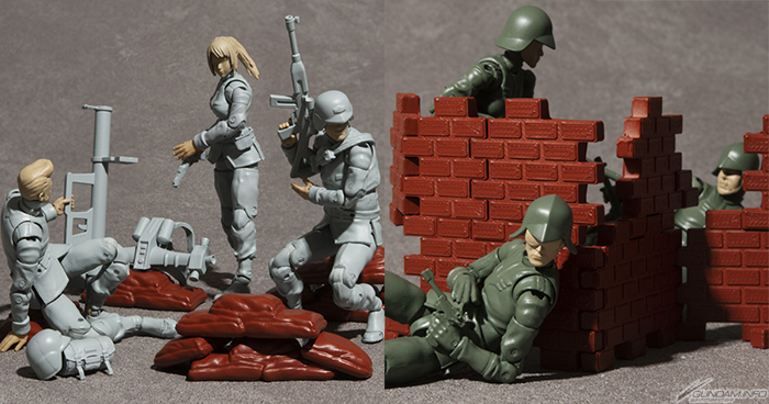 各部可動式のフィギュアは約1/18スケール(約10cm)の従来どおりのサイズで、彩色は単色モデルとすることにより、カスタムの幅が大きく広げられている。目の表情バリエーションをはじめ、階級章や各種マークが盛りだくさんの水転写デカールに加え、兵士をイメージした各種兵装やハンドパーツも付属。