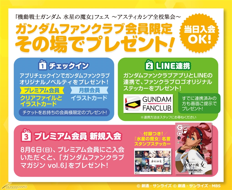 さらに、イベント当日にプレミアム会員に入会した人には、会報誌「ガンダムファンクラブマガジン vol.6」に加え、スレッタのクリアファイルとイラストカードがプレゼントされる。