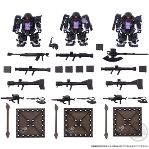標準装備のジャイアント・バズ、ザク・マシンガン、ヒート・ホークのほか、バズーカA2型、大型ヒート・ホーク、ライフル ASR-78といった一部新規造型を含む豊富な武器パーツが付属し、各機体ならではの装備を再現。ボーナスパーツとして頭部に取り付けるブレード・アンテナも同梱される。