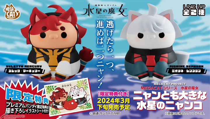 人気のキャラクター達が全員“猫”に大変身しちゃう「MEGA CAT PROJECT」に、『機動戦士ガンダム 水星の魔女』よりスレッタとミオリネが、にゃーんとも大きなソフビフィギュアになって登場。