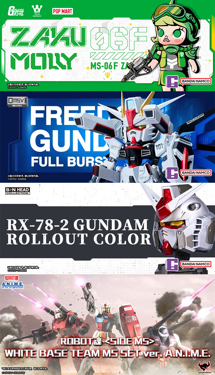 また、海外限定フィギュアシリーズ「QMSV mini」より「Freedom Gundam FULL BURST MODE」、人間サイズのヘッドモデルコレクションシリーズ「GUNDAM HEAD Collection」より「RX-78-2 GUNDAM ROLLOUT COLOR」、ROBOT魂 ver.A.N.I.M.Eのガンダム、ガンキャノン、ガンタンクがセットになった「ROBOT魂<SIDE MS> ホワイトベース隊 MSセット ver. A.N.I.M.E.」が登場している。