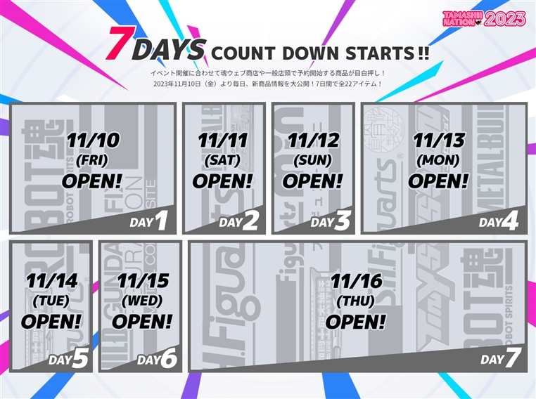 11月10日(金)より、イベント開催に合わせて魂ウェブ商店や一般店頭で予約受付がスタートするアイテム全22点を公開する「7DAYS COUNT DOWN」がスタート。新アイテムが目白押しとなっているので、ぜひチェックしてみよう。