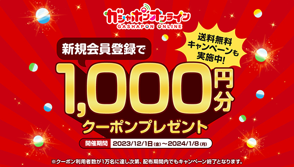 なお、「ガシャポンオンライン」では現在「冬のガシャポンまつり」を開催中。期間中先着1万人で、新規会員登録した人に1,000円分のクーポンがプレゼントされるほか、予約販売商品の初回購入時に、1会計5,000円(税込)以上購入すると送料が無料になるキャンペーンを実施しているので、この機会をお見逃しなく。