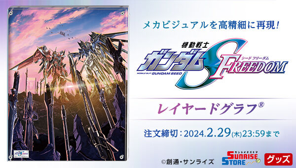 プレミアムバンダイ内「サンライズストア」で好評受付中の「機動戦士ガンダムSEED FREEDOM レイヤードグラフ®」の予約は、本日2月29日(木)23:59に受付終了となる。5月発送予定、価格は16,500円(税込)。