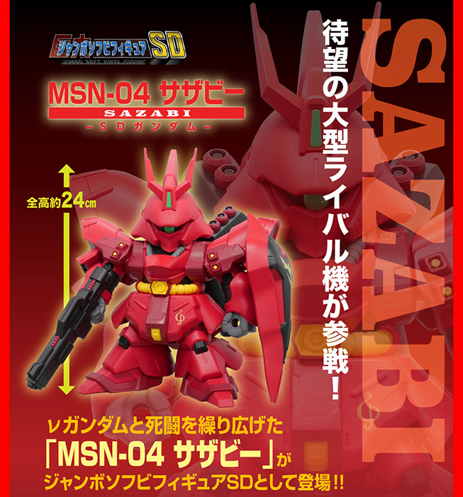 「ジャンボソフビフィギュアSD」シリーズに、『機動戦士ガンダム 逆襲のシャア』より、シャア・アズナブルの搭乗機「サザビー」が全高約24cmのビッグサイズで登場。