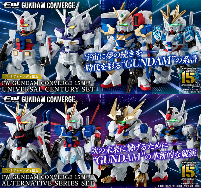 プレミアムバンダイ限定アイテム「FW GUNDAM CONVERGE 15周年 UNIVERSAL CENTURY SET」と「FW GUNDAM CONVERGE 15周年 ALTERNATIVE SERIES SET」の予約受付が、本日よりプレミアムバンダイ内「キャンディオンラインショップ」にてスタートした。いずれも2026年4月発送予定。