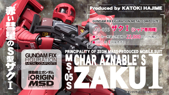 ダイキャストとABSをメイン素材とした完成品モデル「GUNDAM FIX FIGURATION METAL COMPOSITE」(G.F.F.M.C)より、「MS-05S ザクI(シャア専用機)」が2021年1月に発売される。価格は22,000円(税込)。
