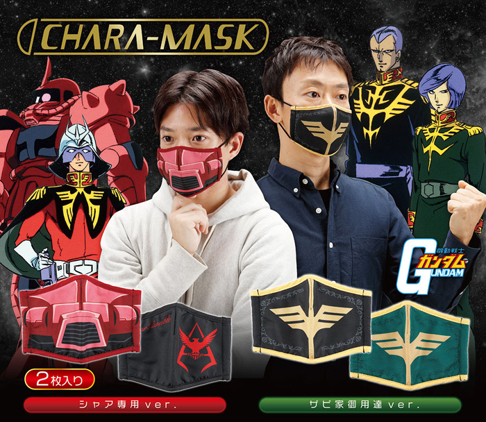 老舗マスク専業メーカーが作るキャラクターマスク「CHARA-MASK(キャラマスク)」シリーズ第2弾として、『機動戦士ガンダム』より「シャア専用ver.」と「ザビ家御用達ver.」の2種が、大人用立体布マスク2枚入りセットで登場。
