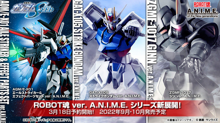 ロボットフィギュアシリーズ「ROBOT魂 ver. A.N.I.M.E.」の新展開として、『機動戦士ガンダムSEED』より「ストライクガンダム」と「エールストライカー&エフェクトパーツセット」が9月に、「ジン」が10月に発売されることが決定した。