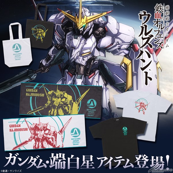主人公機「ガンダム・端白星」と劇中のキーアイテムである「ウルズハントリング」を、シンプルで普段から使いやすいデザインに仕上げた、「Tシャツ」「トートバッグ」「フェイスタオル」がラインナップする。