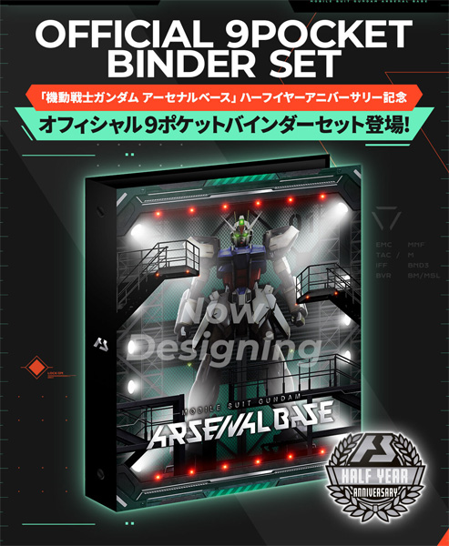 本アイテムは、全国のアミューズメント施設などで好評稼働中のアーケードカードゲーム「機動戦士ガンダム アーセナルベース」のハーフイヤーアニバーサリーを記念したもので、格納庫をイメージした「9ポケットバインダー」と、カードの収納に役立つ「ラベリングカード」や、「プロモーションカード」などがひとつになった豪華セット。