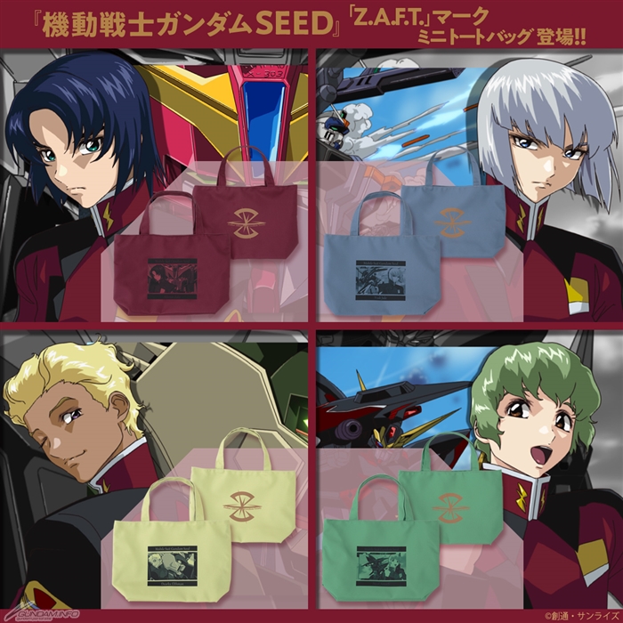 『機動戦士ガンダムSEED』の「Z.A.F.T.」のパイロットをイメージしたカラーのミニトートバッグに、「Z.A.F.T.」のマークと各キャラクターのイラストをデザイン。
