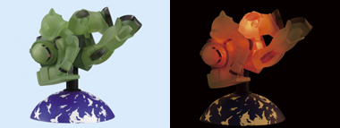 「ザク」の大気圏突入シーンをイメージした光るフィギュア。内臓のライトで緑色の「ザク」が赤色に変色します。