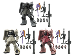 「シャア専用ザク」に加え、戦地に応じたカラーリングの「ザク(寒冷地戦仕様)」と「ザク(砂漠地戦仕様)」をアソート。