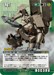 「人革連の荒熊」セルゲイ・スミルノフの機体。合計国力が低いのでグラハムの機体には見劣りするかもしれないが、「戦闘配備」と格闘力3という戦闘力に「速攻デッキ」と相性の良いダメージ系テキストが優秀。「知略の猛将」には《支援機の配備》や《ザクキャノン(イアン・グレーデン機)》といったユニットとして扱うコインを生み出すギミックもあるので、その効果が期待できる!