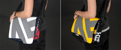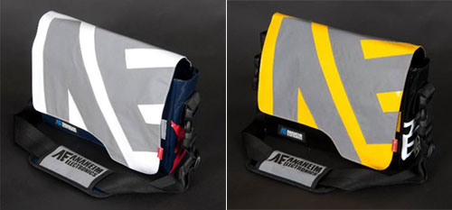人気のメッセンジャーバッグタイプを採用し、フラップ部分にはアナハイム・エレクトロニクスの“AE”マークを大胆にデザイン。