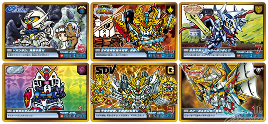 “ノーマル”、“武者”、“外伝”、“コマンド”、“SDV”、“ガンドランダー”の6つのSDガンダムワールドより、新規描き起こし20種以上を含む全72種の選りすぐりのキャラクターを収録し、キラキラ光る「プリズムカード」21枚と、金色箔押しフレーム採用の「通常カード」51枚で構成される。
