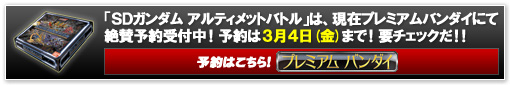 プレミアムバンダイ・カードダスショップで明日3月4日(金)まで予約受付中の カードダスコンプリートボックススペシャル「SDガンダム アルティメットバトル」を 全3回の集中連載で紹介! 商品の公式HPはこちら! ⇒ http://www.carddas.com/sd20th/ |