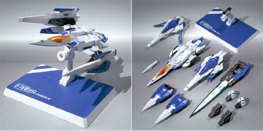機首センサーカバーパーツと粒子貯蔵タンクが付属し、TV版に加えて劇場版のダブルオーライザーも再現可能。「オーライザー」は、駐機用スキッドの開閉が可能なほか専用台座も付属する。