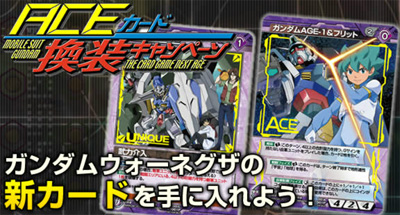 「ガンダムウォー」の特定のACEカードを、「ガンダムウォー ネグザ」のACEカードに交換するキャンペーンの詳細が公開された。ぜひともチェックして、「ガンダムAGE-1&フリット」と「武力介入」のカードをゲットしよう!
